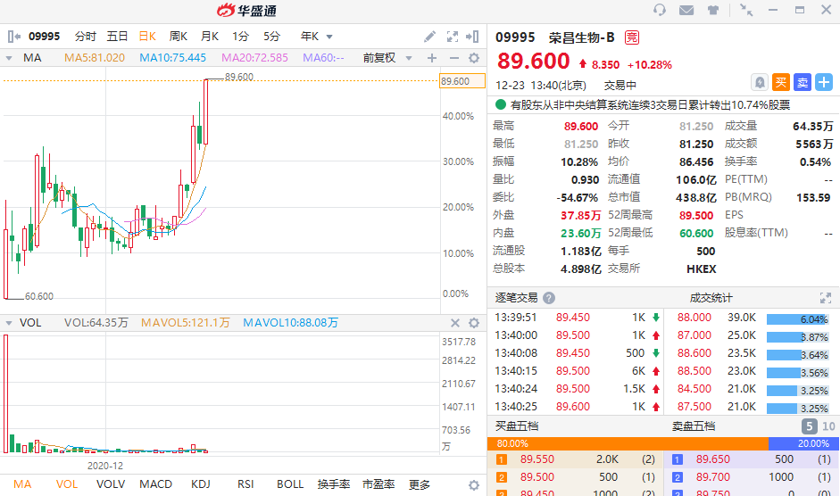 华盛资讯12月23日消息,荣昌生物-B(09995)午后持续走强,涨幅高达10%,创历史新高。截至发稿,荣昌生物涨10.28%%,现报89.6港元每股,当前成交额5563万港元,总市值438.8亿港元。较发行价52.10港元已涨超70%。