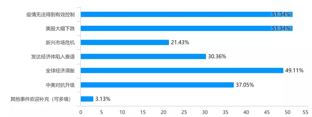 受访者最担心的全球风险是疫情无法得到有效控制、美股大幅下跌、全球经济疫后陷入滞涨。另有超三成担心中美对抗升级和发达经济体陷入衰退,两成担心新兴市场危机。