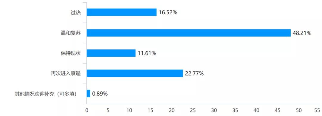受访者对明年疫情控制后的美国经济走势产生分歧:48.21%认为会温和复苏,22.77%认为会再次进入衰退,16.52%认为会过热,11.61%认为会保持现状。