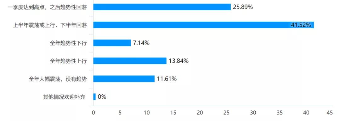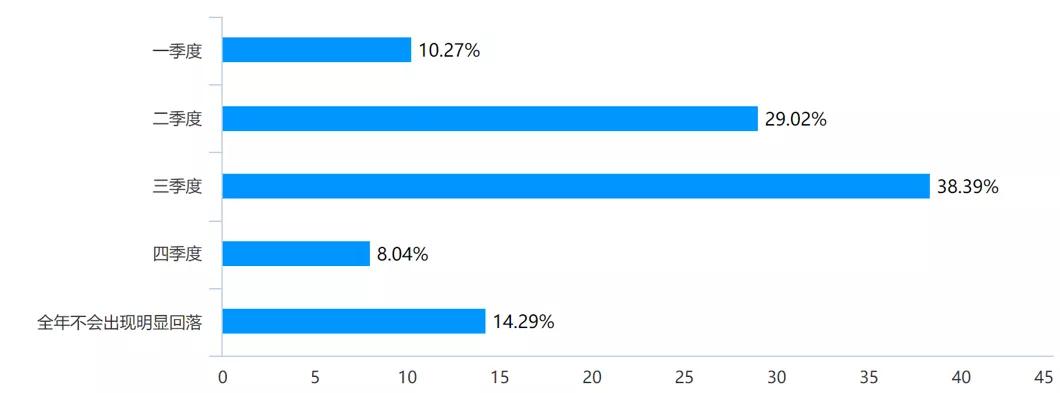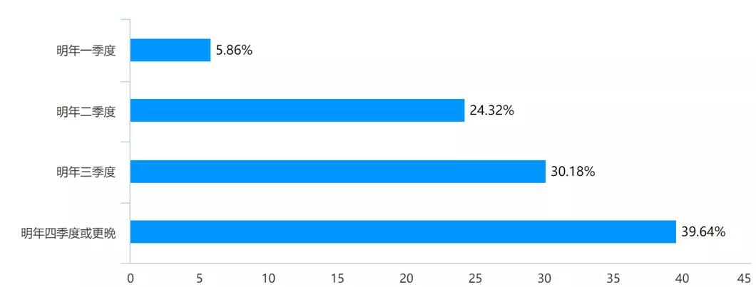 多数受访者认为明年出口会出现环比回落,但对环比回落的时间产生分歧。38.39%的受访者认为三季度回落,29.02%认为二季度回落,10.27%认为一季度回落,8.04%认为四季度回落,还有14.29%认为全年不会出现明显回落。