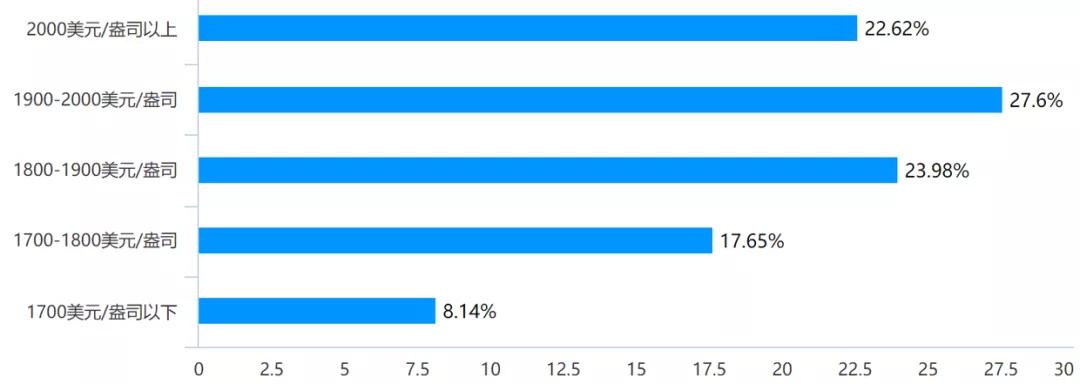 受访者对明年黄金价格预期存在分歧,认为明年末黄金价格(美元/盎司)在1800-1900(-2%~3%)、1900-2000(3%~9%)、2000以上(大于9%)的受访者均有两到三成,认为金价会低于1800(-2%以下)的受访者占少数。