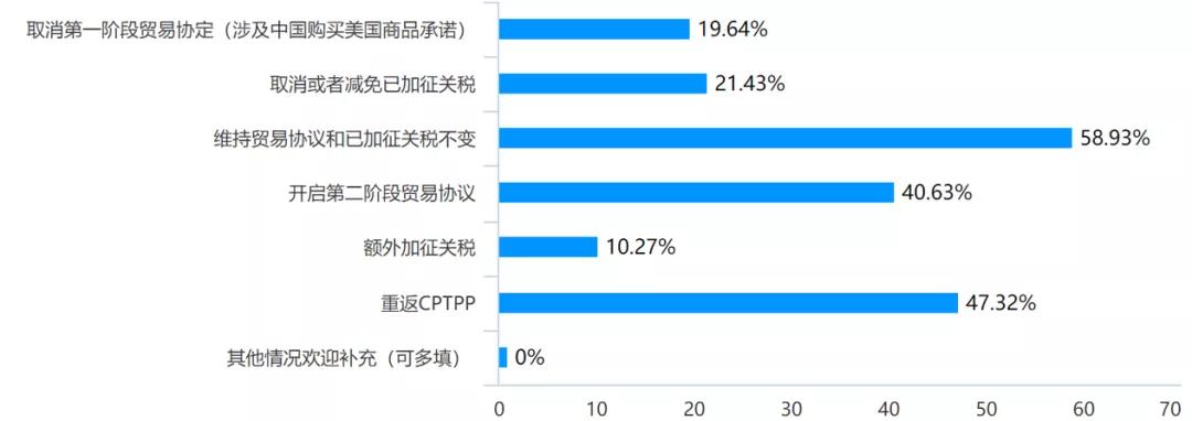 在明年拜登政府将会如何处理国际贸易问题上,多数受访者并不乐观。近六成受访者认为拜登政府会维持贸易协议和已加征关税不变,仅两成认为会取消或者减免已加征关税。对于中美贸易协议,四成认为美国会开启第二阶段贸易协定,两成认为会取消第一阶段贸易协定。另有近五成认为美国会重返CPTPP。