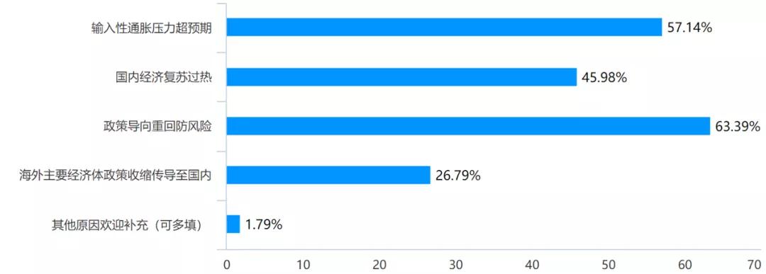 多数受访者认为可能导致明年政策偏紧的主要原因来自于监管政策取向和输入性通胀,另外还有国内经济复苏过热。