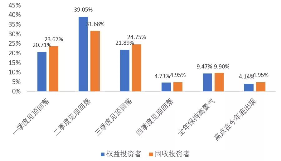 股票投资者和债券投资者对于明年中国GDP的预测区间分布总体相差不大。债券投资者对明年GDP增速中枢略微悲观,对二季度经济环比见顶回落的一致预期略低于股票投资者。