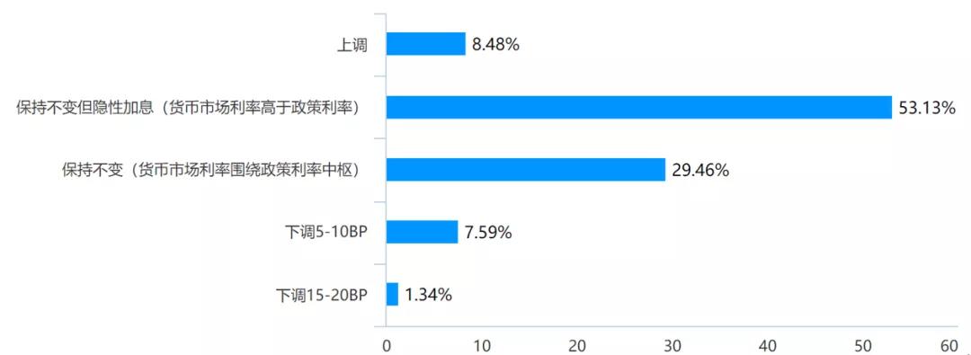 认为可能降准的受访者,对于降准的时间预期存在分歧。虽然往年年初降准的概率较大,但当前货币政策态度下,仅两成受访者认为降准会发生在一季度,多数受访者认为降准可能的时点发生在明年二季度或三季度的概率更高。