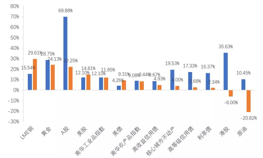 去年底的一致预期调查,受访者最看好的资产是A股、港股和黄金。其中黄金和A股今年的实际收益率位居前三名,而港股排名倒数第二,仅好于原油。今年表现超受访者预期的资产有LME铜、美股和美债,反映出2020年资产定价的主要逻辑是流动性驱动的风险资产的估值提升和大宗商品的金融属性提升。
