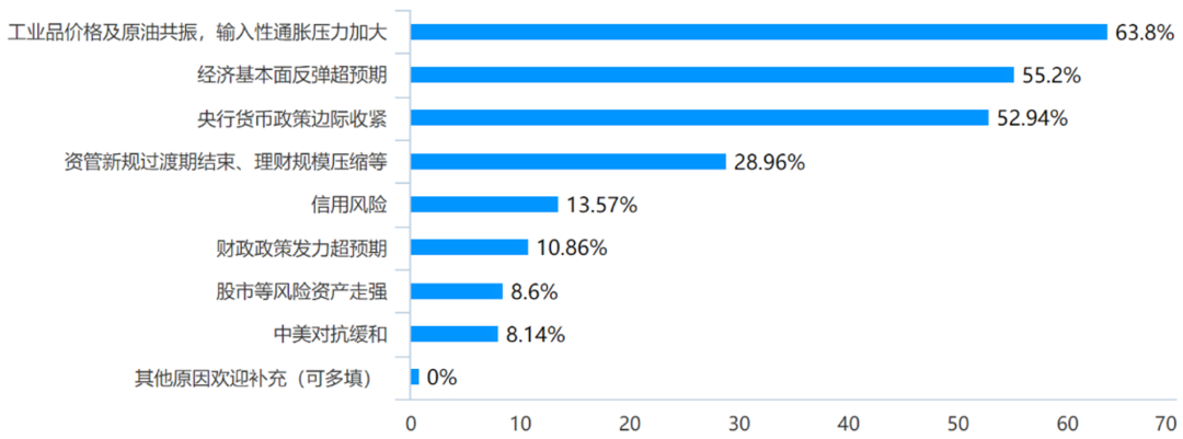 超六成受访者认为工业品价格及原油共振,输入性通胀压力加大是推动明年利率上行的主要风险,紧随其后的因素是经济基本面反弹超预期和和央行货币政策收紧,分别占受访者的55.2%和52.94%。