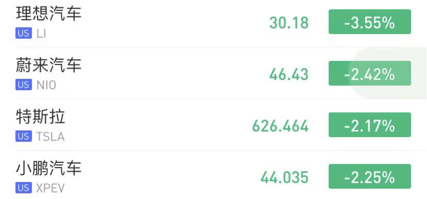 华盛资讯10月23日讯,新能源车企集体下挫,特斯拉续跌超2%,理想汽车跌超3.5%。截至发稿,理想汽车跌3.55%,蔚来汽车跌2.42%,特斯拉跌2.17%,小鹏汽车跌2.25%。