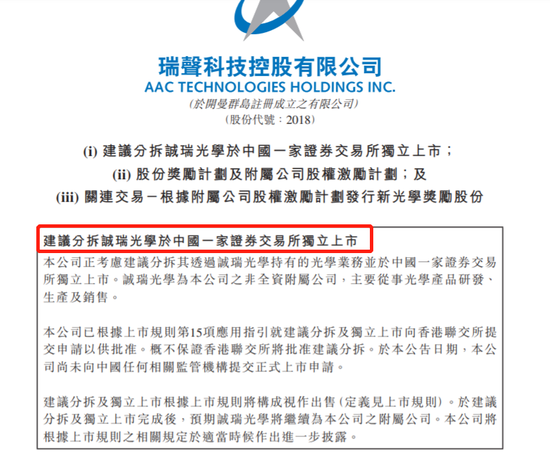 瑞声科技在港交所公告,公司正考虑建议分拆其透过诚瑞光学持有的光学业务并于中国一家证券交易所独立上市。诚瑞光学为本公司之非全资附属公司,主要从事光学产品研发、生产及销售。