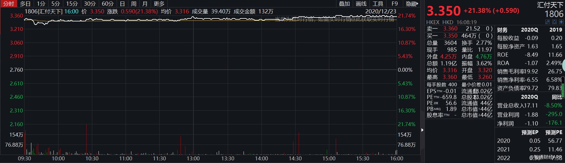 受益于高溢价私有化价格提振,汇付天下12月23日开盘大涨,截至收盘涨幅高达21.38%,报价3.35港元每股,距3.5港元的要约价格仅一步之遥。