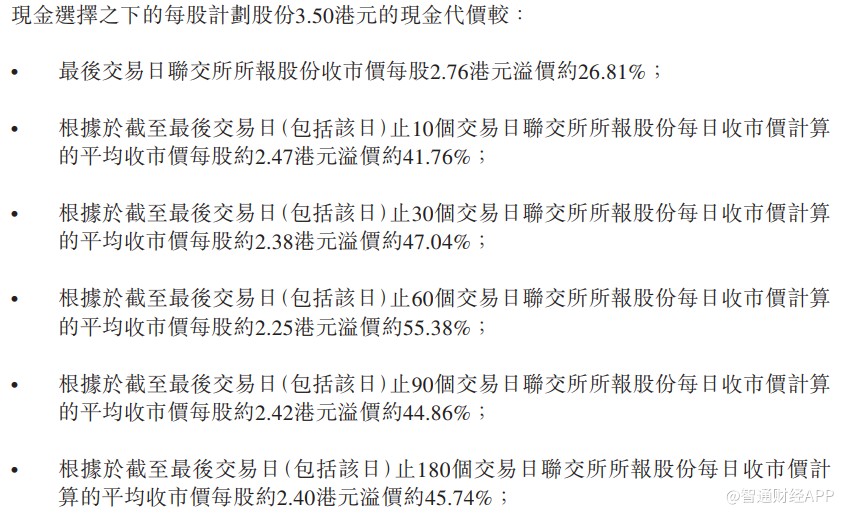 从每股收取3.5港元现金来看,该方式较市场价格有明显溢价。智通财经发现,该价格较12月21日(停牌日)的价格高出26.81%;较12月21日止10个、30个、60个、90个、180个交易日的平均价格分别高出41.76%、47.04%、55.38%、44.86%、45.74%。