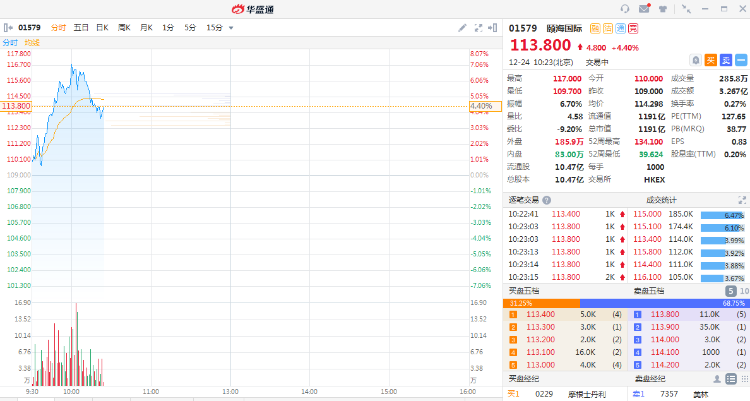 颐海国际(1579.HK)近期自底部持续反弹,现报113.8港元创2个月新高价,涨4.4%,月内已升超25%。暂成交5.267亿港元,总市值1191亿港元。