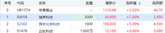 产业链上的企业瑞声科技、舜宇光学科技、丘钛科技受此消息影响,股价同步上涨。截至发稿,瑞声科技涨7.20%,报43.95港元,此前公告称,拟分拆诚瑞光学独立上市,舜宇光学科技涨5.39%,报166.2港元,逼近52周新高,丘钛科技涨0.66%,报12.16港元。