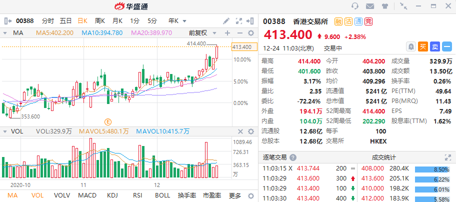 华盛资讯12月24日消息,香港交易所(00388)上午一路高开高走,股价创历史新高。截至发稿,港交所涨2.38%,现报413.4港元每股,当前成交额13.5亿港元,总市值达到5241亿港元。