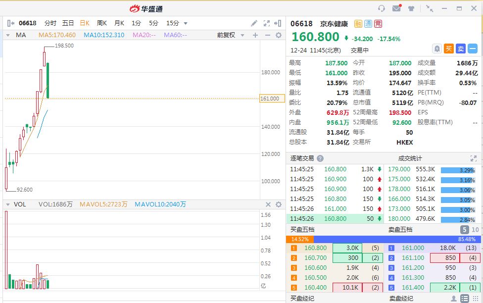 京东健康现跌17%,报160.8港元,市值5119亿港元。此前连续创新高,前四个交易日累涨近40%。