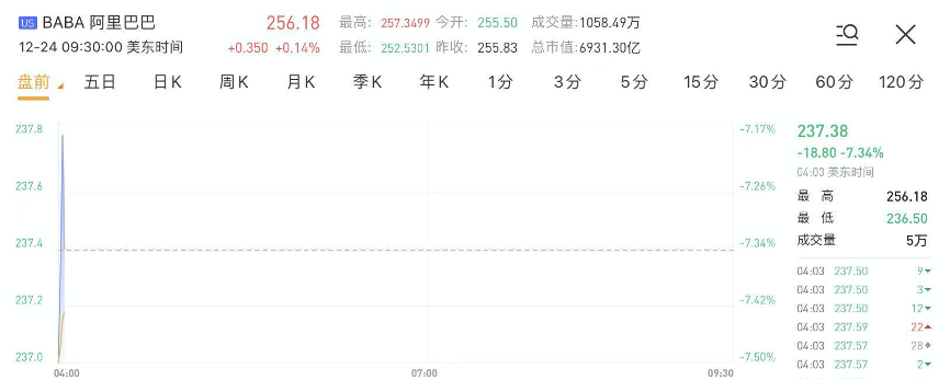 华盛资讯12月24日讯,阿里巴巴(BABA)美股盘前大跌超7%,市场监管总局依法对阿里巴巴集团涉嫌垄断行为立案调查。