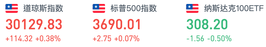 美股周三收盘涨跌不一,道指涨0.38%,报30129.83点;纳指跌0.29%,报12771.11点;标普500指数涨0.07%,报3690.01点。金融股普遍上涨。道指成分股摩根大通收高2.8%,高盛涨2.6%,美国运通上涨2.1%。