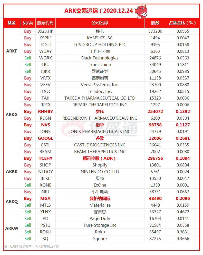 ARK平安夜不停歇,交易次数较前日更为频繁,其中重点交易有: