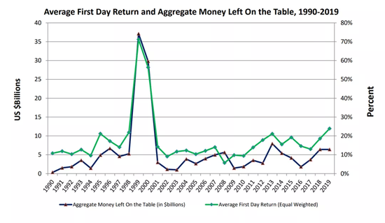 Jay R. Ritter教授对于IPO的实证研究数据显示,1980年至2019年间,总计8610个发行价高于5美金的IPO中,IPO首日的平均涨幅在18%。如果将这个涨幅,换算成是公司由于IPO价格定价过低而损失的融资金额的话,该金额总计高达1720亿美金。而在近10年间,IPO首日平均涨幅也有16%左右。