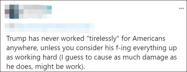 “特朗普从来没有在任何地方为美国人‘不知疲倦地’工作过,除非你认为他把一切搞砸了就是在努力工作(我猜他造成的破坏这么大,可能就是工作)。