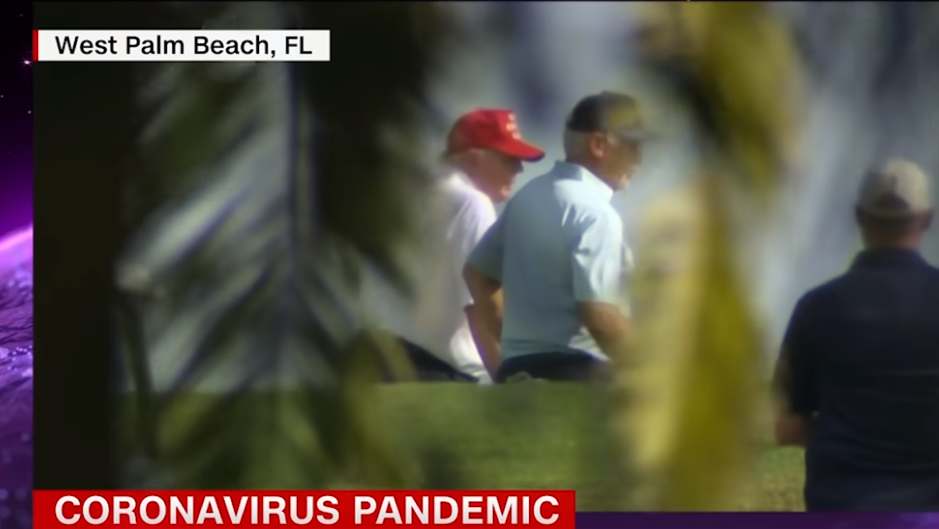 美东时间24日上午10时18分,特朗普的车队驶入特朗普国际高尔夫俱乐部。美国有线电视新闻网(CNN)的摄像机在球场上发现了特朗普的身影,他一如既往地穿着白上衣,戴着小红帽。