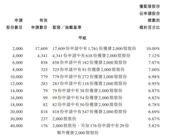 公开发售每手2000股,一手中签率10%,申购15手稳获一手,乙头获配393手。