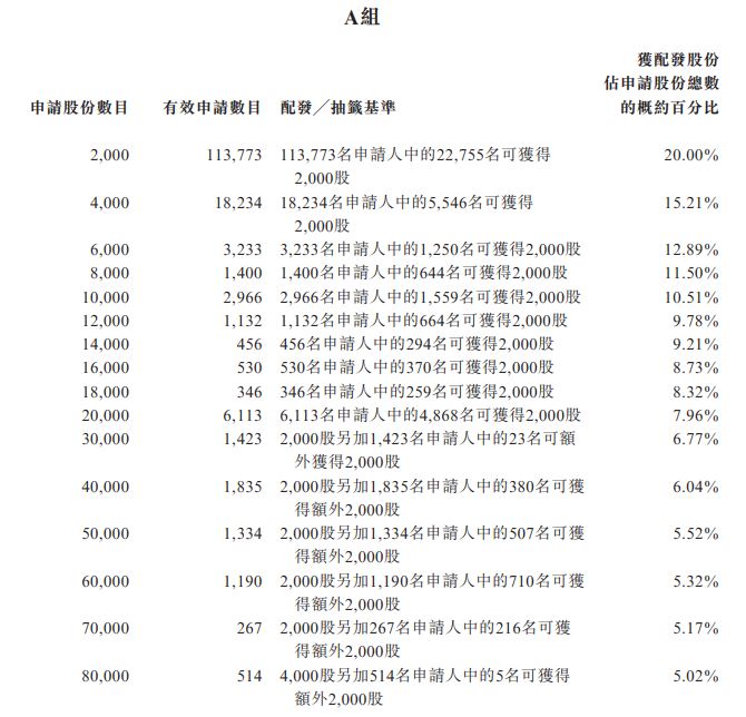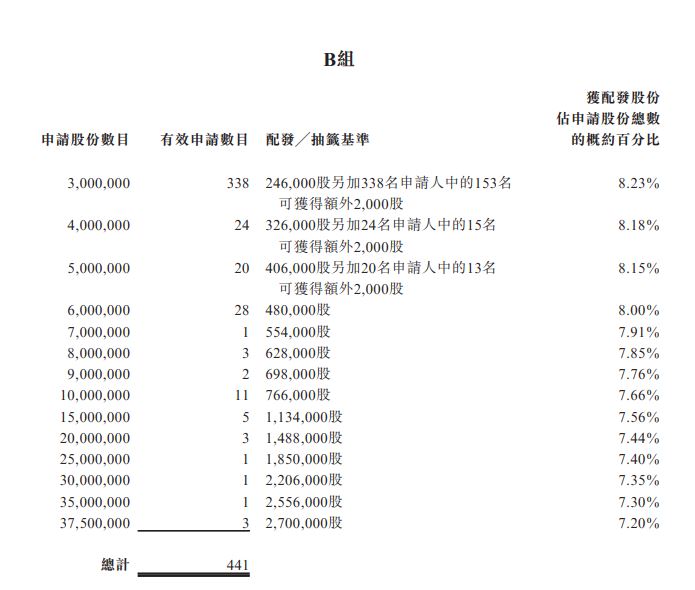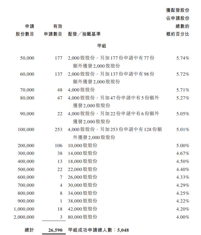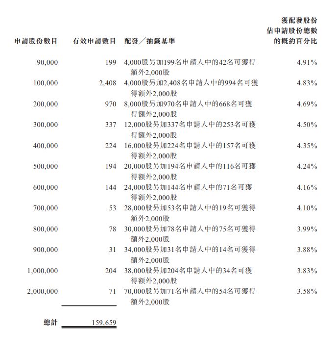 根据香港公开发售初步提呈的香港发售股份已获轻微超额认购。合共接获2.66万份有效申请,认购合共约3.03亿股香港发售股份,相当于香港公开发售项下初步可供认购的香港发售股份总数3000万股约10.09倍。因此,香港公开发售项下的发售股份的最终数目为3000万股股份,相当于全球发售项下初步可供认购发售股份总数的10%。