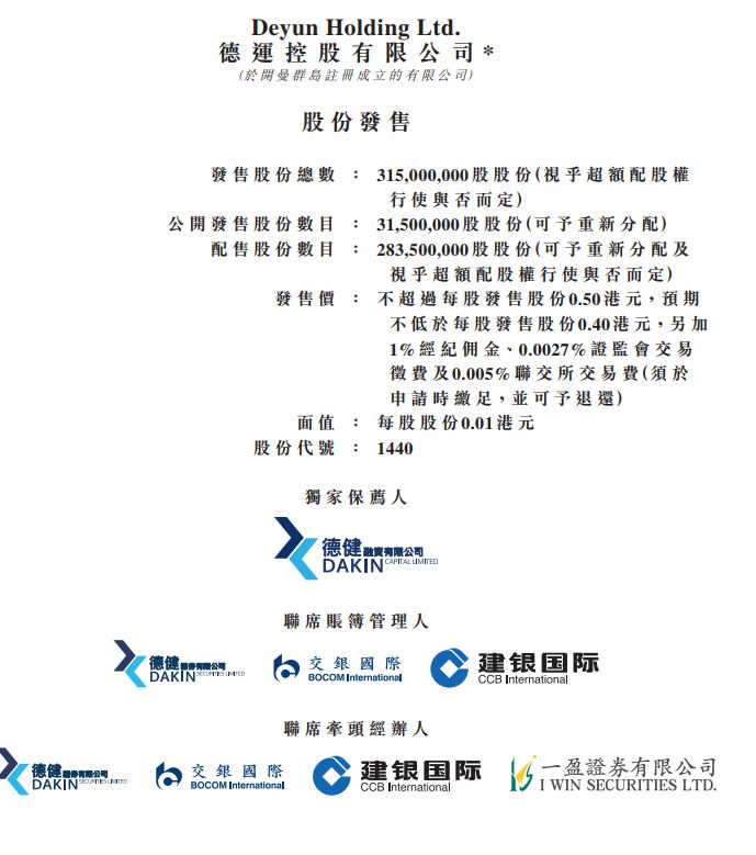 华盛资讯12月28日消息,DEYUN HOLDING(01440)今日至12月31日招股。预期2021年1月13日上市,德健融资有限公司为独家保荐人。