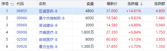 这六只生物医药B类股集体大涨,截至发稿,亚盛医药-B涨超14%领涨,康宁杰瑞制药-B涨近10%,诺诚健华-B、沛嘉医疗-B涨近7%,启明医疗-B涨超5%,康方生物-B涨超3%。
