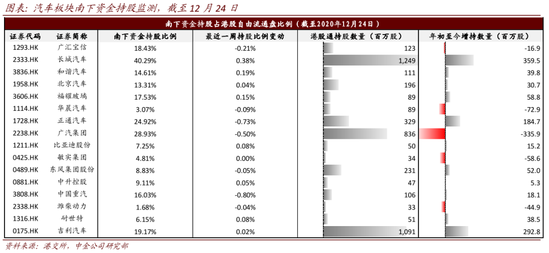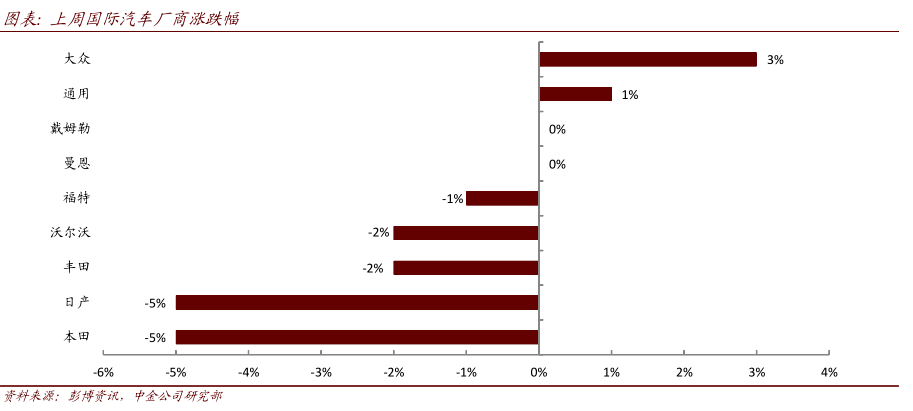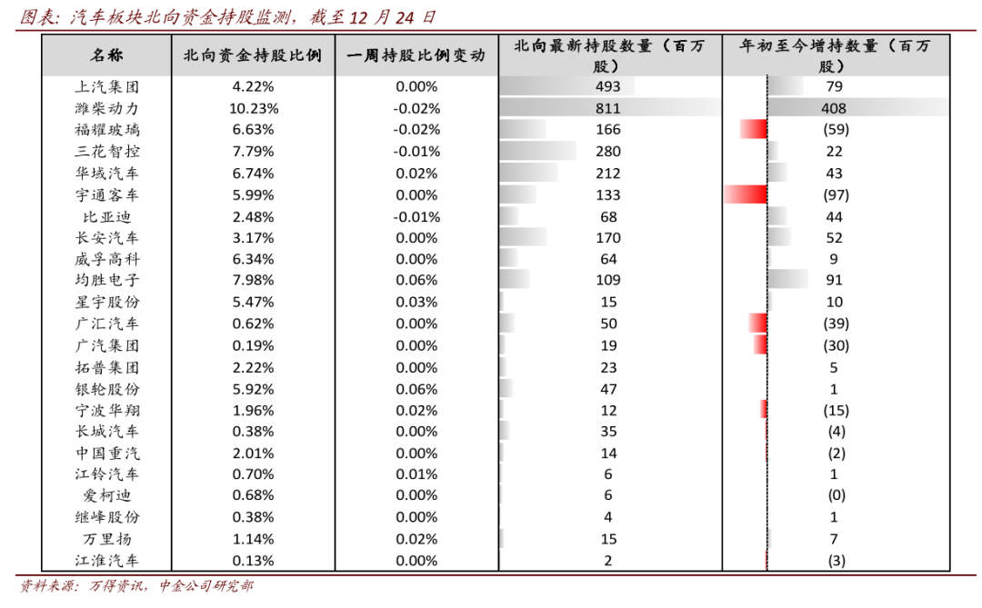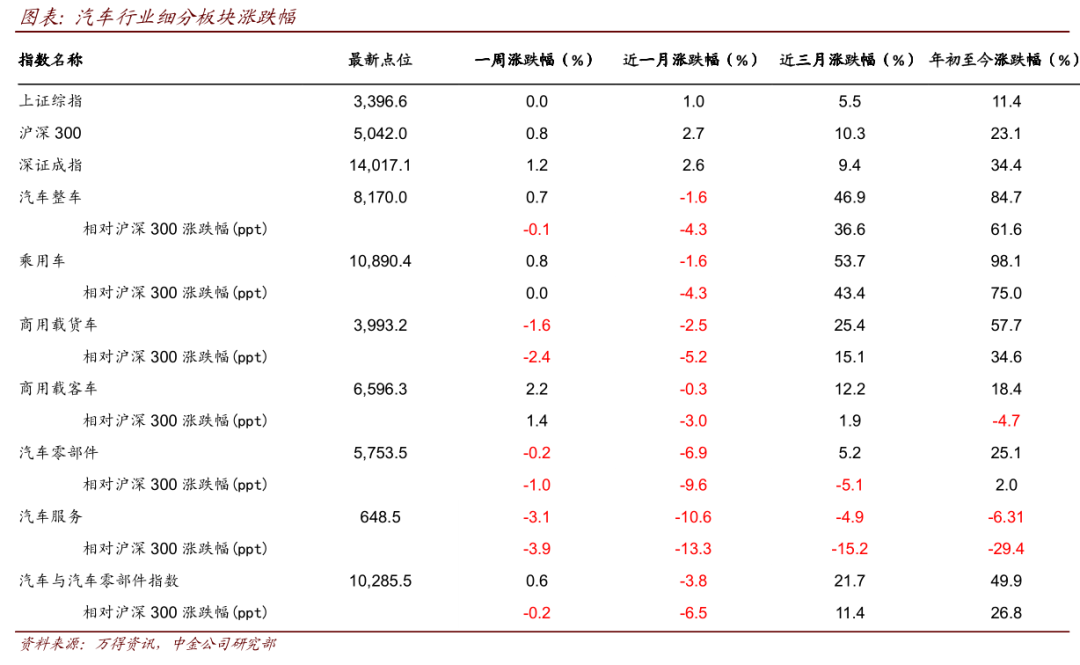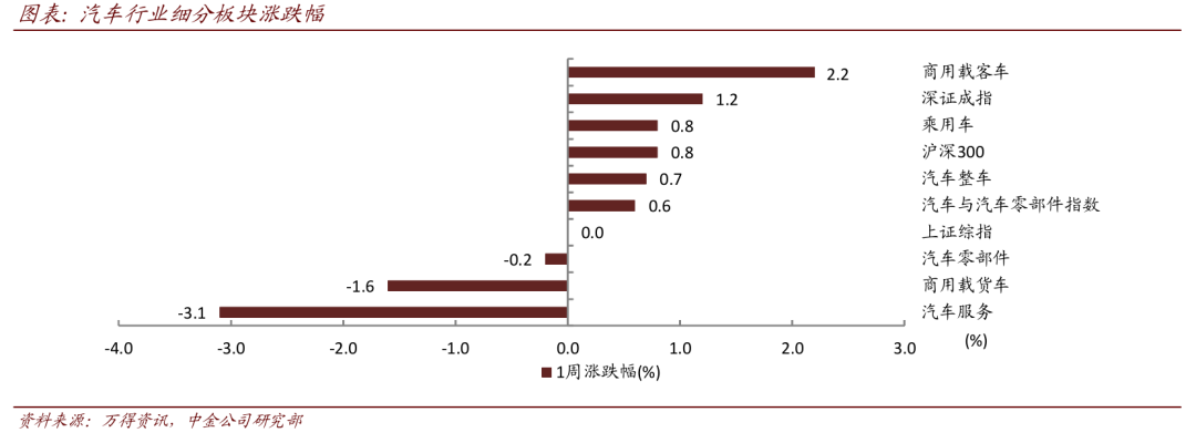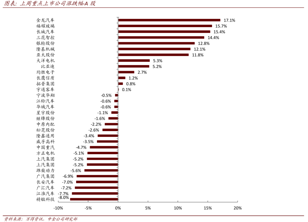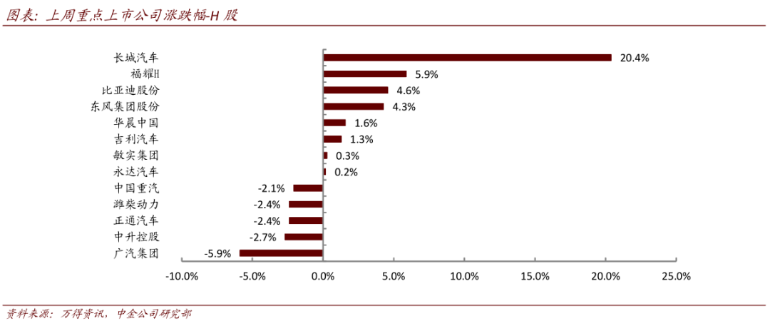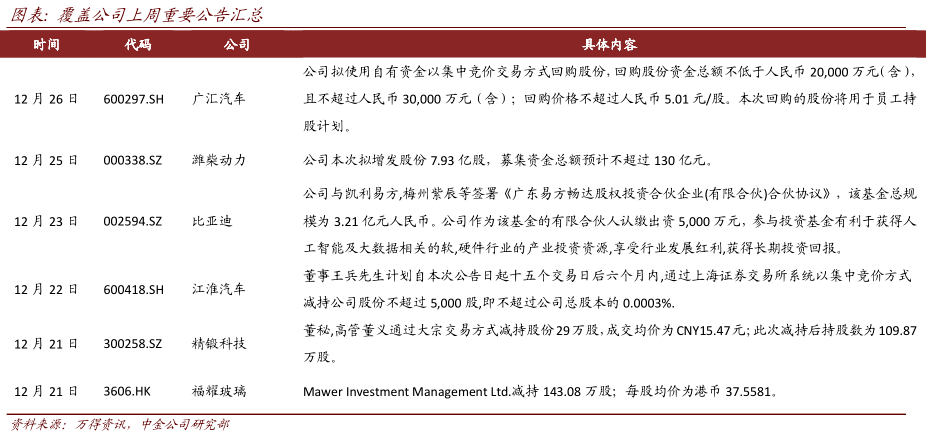 上周(12月21日-12月25日)沪深300指数+0.8%,A股汽车整车板块+0.7%,跑输大盘0.1ppt,汽车零部件板块-0.2%,跑输大盘1.0ppt。个股方面,A股中,金龙汽车以17.1%的涨幅领涨,精锻科技以-8.0%的跌幅位列最后。H股中,长城汽车(02333)以20.4%的涨幅位列最前,广汽集团(02238)以-5.9%的跌幅领跌。