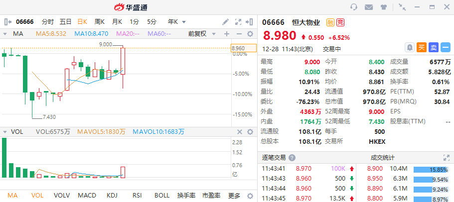 华盛资讯12月28日消息,恒大物业(06666)盘中涨幅扩大,一度涨超6%破顶,最高见9.00港元。截至发稿,恒大物业涨6.52%,现报8.98港元,成交量6577万股,成交额5.828亿港元,总市值达970.8亿港元。