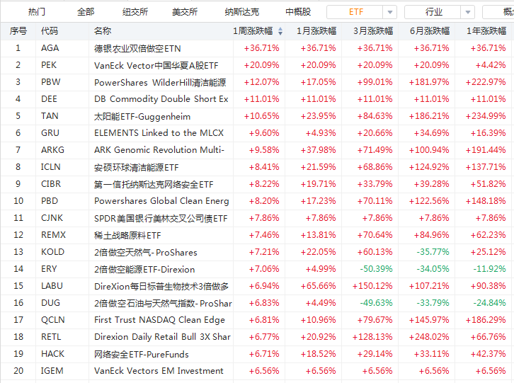 从ETF表现管中窥豹,可以看出清洁能源依然是上周表现最为强势的板块之一,做多清洁能源的PBW以12.07%的涨幅位列上周美股ETF涨幅榜首位,太阳能ETF以10.65%的涨幅位列第二,这两只ETF都无杠杆,足以说明其成分股的靓丽表现。(AGA/PEK/DEE已退市)