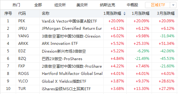 美股主要股指方面,依然是罗素2000指数领涨,相关做多ETF多只涨幅靠前,而做多新股和次新股的ETF复兴IPO ETF也以近3%的周涨幅跑赢多数股指ETF。