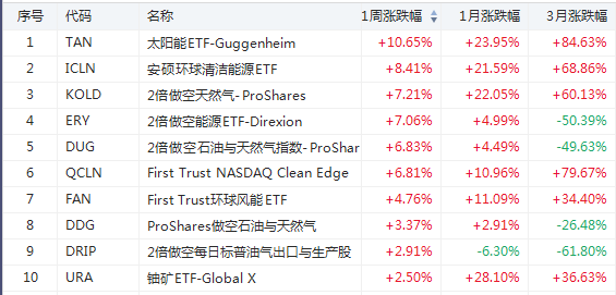 在太阳能大受追捧的背景下,天然气与能源却表现出相反的走势,2倍杠杆做空天然气和能源股的KOLD和ERY上周都跌超7%。
