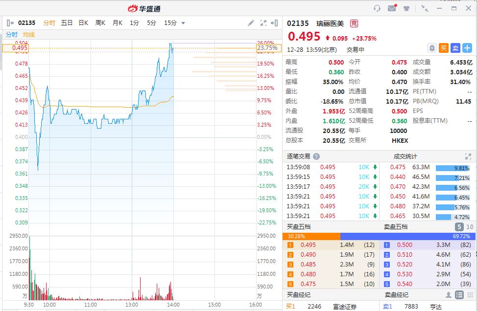 瑞丽医美今日首挂,早盘大幅高开后走弱,股价午后走高,目前涨幅大涨23.75%,市值10.17亿港元。