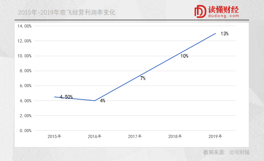 这也使得其经营利润率明显提升,从拐点前的4%提升至2019年的13%。