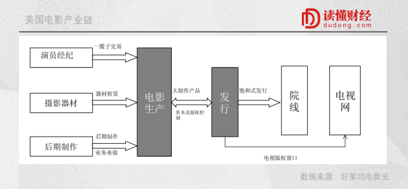 美国影视产业,以福特主义理念为指导,将影视制作进行专业精细分工,影片的生产-发行-放映等不同环节,均由不同公司参与,并且每个产业链环节还将进一步细化。