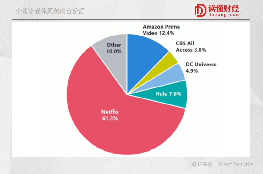 正是对自制内容的长期投入,使奈飞形成了较高的内容壁垒。根据Parrot Analytics数据,2019年,其占据全球流媒体原创内容市场份额的61.3%。