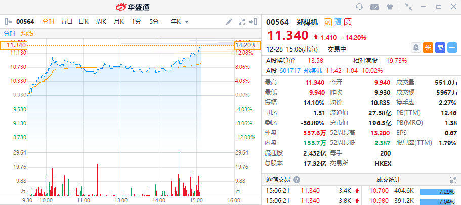 华盛资讯12月28日消息,郑煤机A股涨停,港股盘中涨幅扩大,大涨逾14%。截至发稿,郑煤机涨14.2%,现报11.34港元,当前成交额5967万港元,总市值达196.5亿港元。
