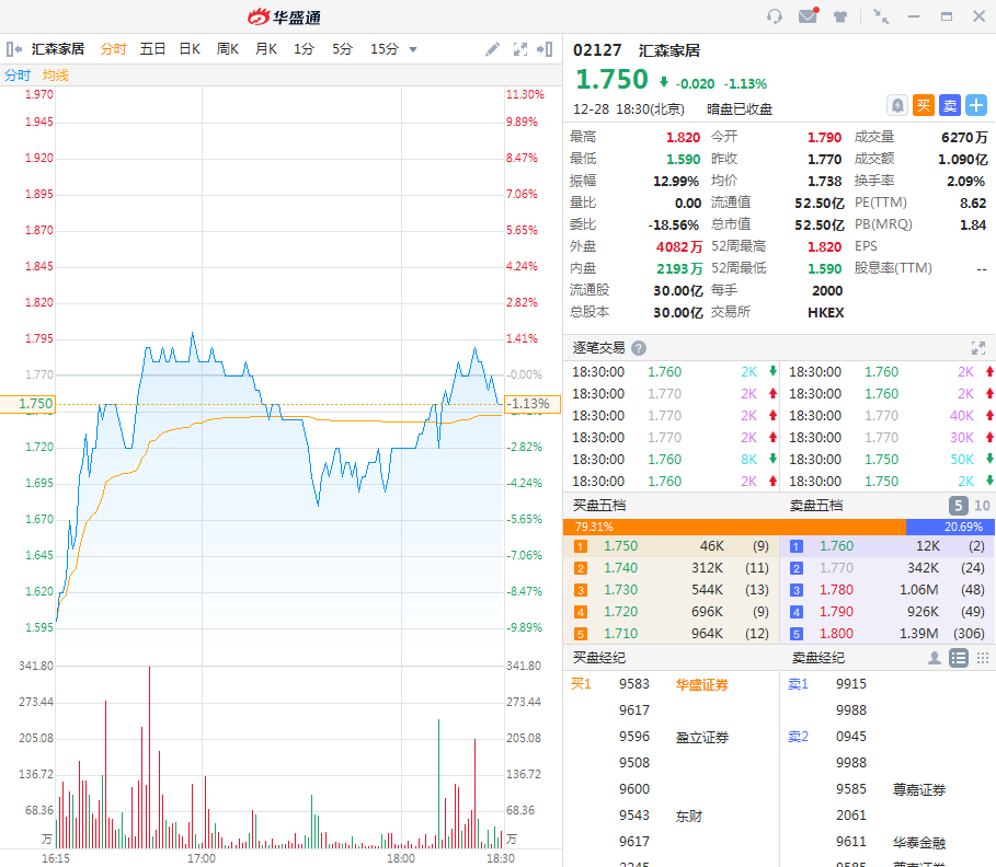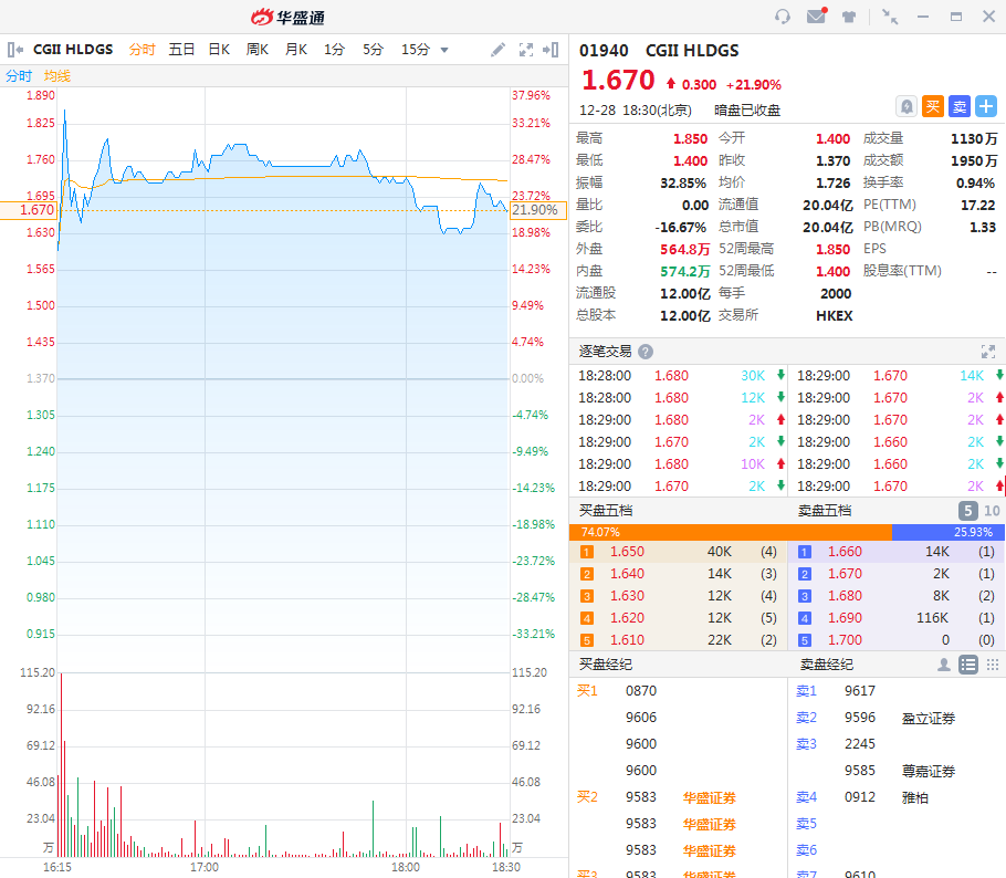 华盛资讯12月28日讯,截至收盘:CGII HLDGS(01940.HK)暗盘收盘报价1.67港元,较发行价1.37港元涨幅为21.9%,一手账面盈利600港元。最新成交额1950万港元,总市值为20.04亿港元;汇森家居(02127.HK)暗盘收盘报价1.75港元,较发行价1.77港元跌幅为1.13%,一手账面亏损40港元。最新成交额1.09亿港元,总市值为52.5亿港元;两股都将于明日正式上市。