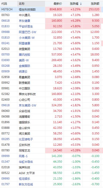 中兴通讯大涨7%,领涨指数成分股;京东健康涨超6%;阿里巴巴、小米集团大涨超5%。美团、腾讯涨超3%。
