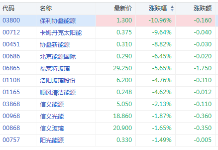 12月29日消息,港股光伏太阳能板块全线下挫,保利协鑫能源跌超10%,卡姆丹克太阳能跌超9%,协鑫新能源跌超8%,北京能源国际跌超6%,福莱特玻璃跌5%,洛阳玻璃股份跌4%,信义光能跌1.87%。