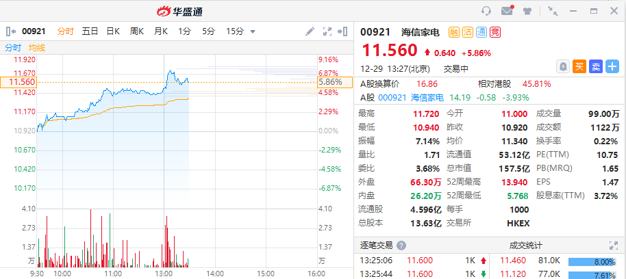 华盛资讯12月29日讯,海信家电(00921)午后小幅拉升。截至发稿,海信家电涨5.86%,现报11.56港元每股,当前成交额1122万港元,当前总市值为157.5亿港元。