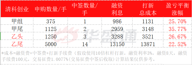 乙头融资打新1250手,以中签3手为例,盈亏平衡点26.67%;