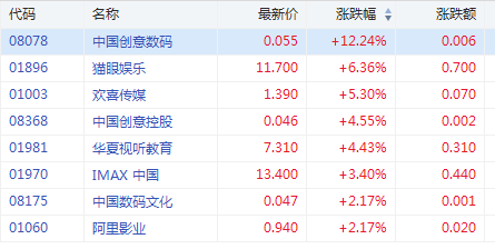 港股影视娱乐股普遍上涨,猫眼娱乐涨6%,欢喜传媒升超5%,IMAX中国涨3.4%,阿里影业亦涨超2%。