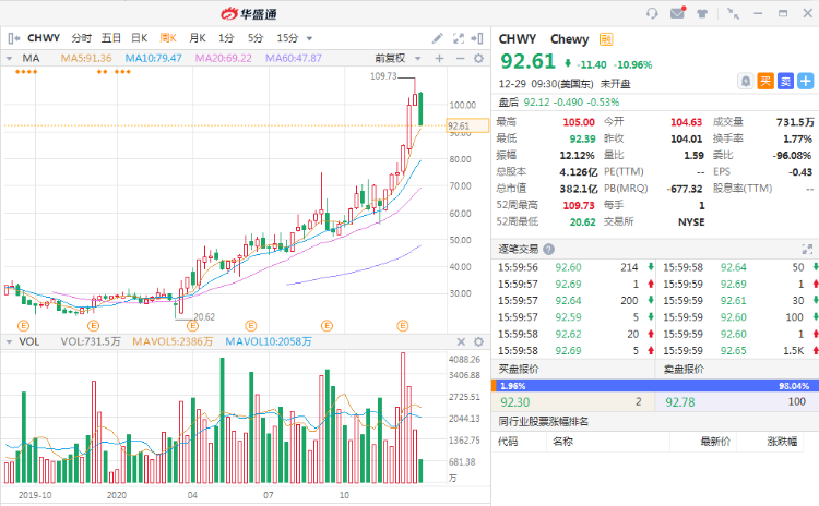 Chewy是一家宠物食品及其他相关产品的在线零售商,总部设在佛罗里达州。年初至今,该股的股价已经上涨了200%,市值近400亿美元。