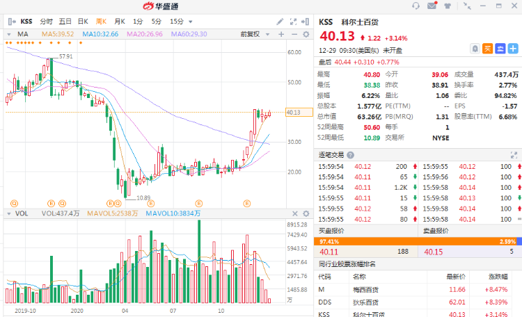 柯尔百货是一家百货连锁店,拥有1100多家分店,在美国除夏威夷以外的每个州都有分店。自1998年以来,该公司一直是标普500指数的成分股。柯尔百货也是2019年美国销售额第二大的百货连锁店,仅落后于梅西百货(M.US)。自今年三月份以来,柯尔百货的股价上涨了200%以上。