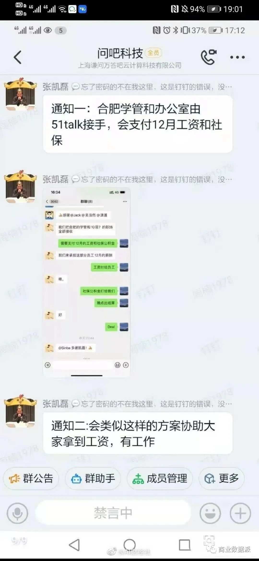 学霸君创始人张凯磊在工作群称:通知一,合肥学管和办公司由51talk公司接手,会支付工资和社保。通知二,会类似这样的方案协助大家拿到工资,有工作。