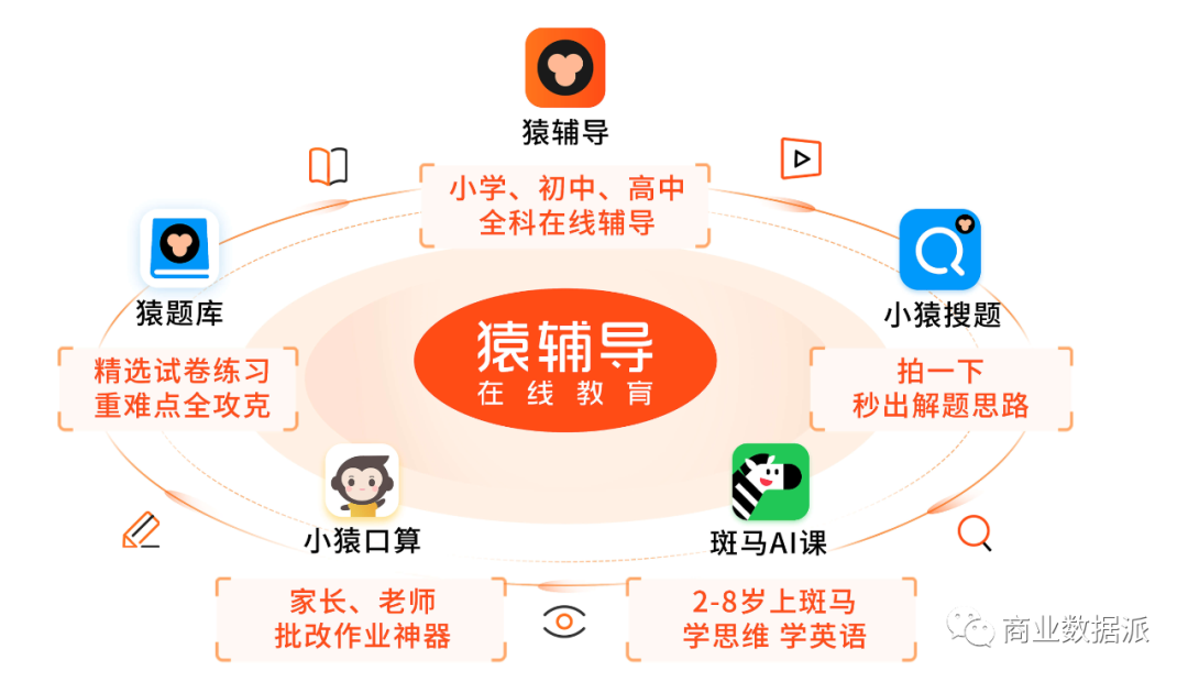 猿辅导旗下拥有猿辅导、猿题库、小猿搜题、小猿口算、斑马AI课等多款在线教育产品,累计服务用户超过4亿人,其中“猿辅导”和“斑马AI课”两大网课正价在读学生人次共计370万左右。其近年来异军突起的“斑马AI课”,则与猿辅导投资的火花思维、字节跳动的“瓜瓜龙”系列,网易有道“小狸”系列共同角逐低幼启蒙课程市场。