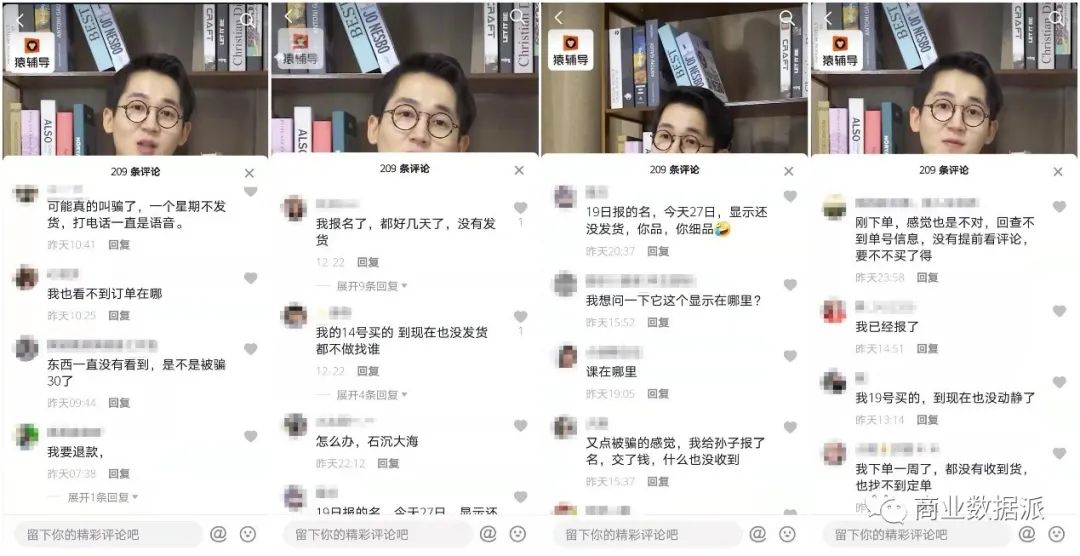但点开上图最左侧的广告视频,209条评论几乎都是报名近十天未发货,想要退款联系不上客服之类的吐槽。